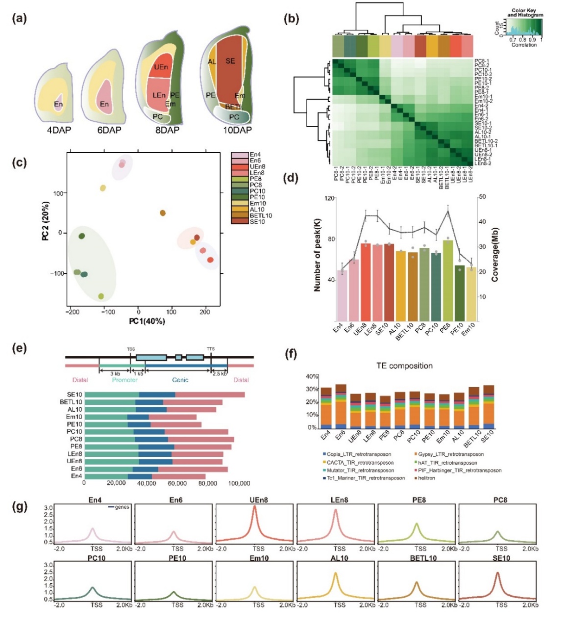 本研究选取了授粉后4-10天的胚乳和种皮作为研究样本,涵盖了从细胞化完成到灌浆启动这一关键发育阶段。研究团队通过整合RNA-seq和ATAC-seq等多组学分析方法,首次绘制了胚乳发育过程中染色质开放性的动态图谱。此研究不仅加深了对玉米胚乳发育机制的理解,还为植物发育生物学提供了新的研究思路和方向,具有重要的理论意义和实际应用价值。